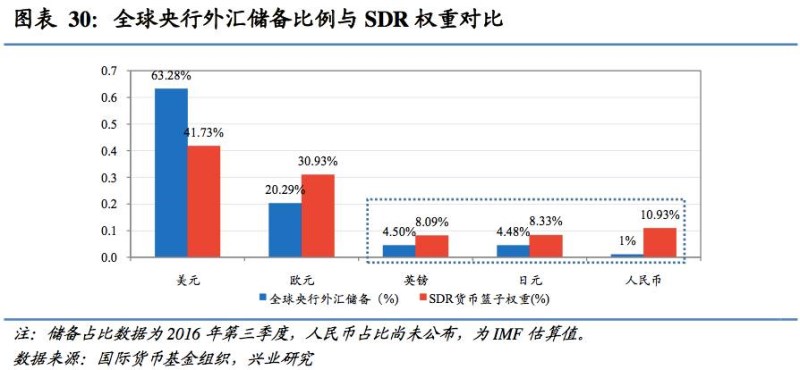 興業(yè)研究今年1月的《人民幣國際化半年報》中就曾分析到,全球央行對于人民幣的儲備需求將逐漸增加 。全球SDR總量為1826億,折成美元僅約3000億美元。以人民幣所占SDR份額10.92%的比例進(jìn)行折算,人民幣由SDR作為收支結(jié)算而引起的增配效果大約為2000億人民幣左右。